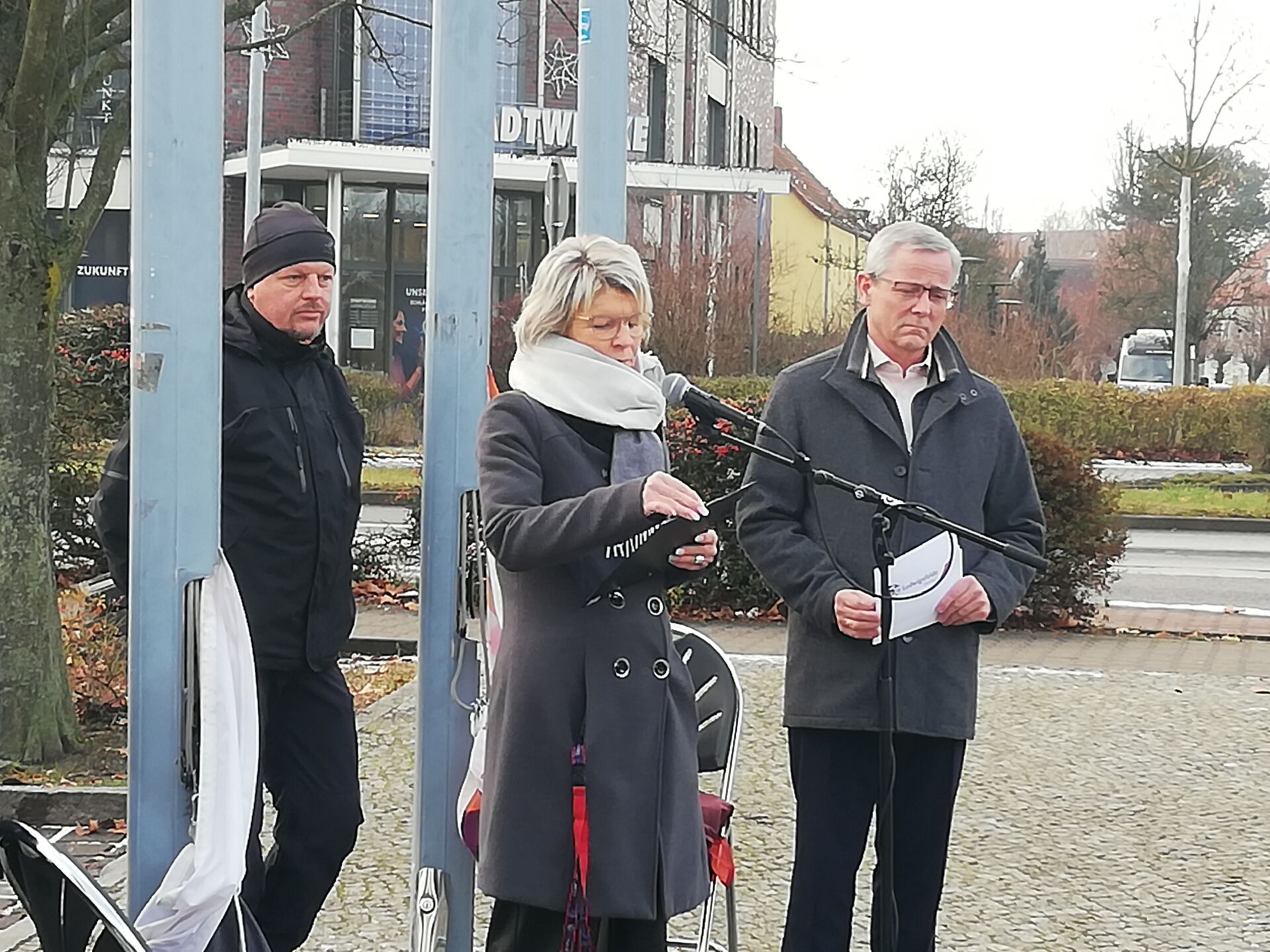 Gekommen zur Fahnenhissung sind morgens bei frostigen Temperaturen sehr viele Ludwigsfelder*innen und Vertreterinnen aus Initiativen und Vereinen: Ludwigsfelder Frauenstammtisch, Familienbündnis Ludwigsfelde, Behindertenbeirat Ludwigsfelde, DRK Jugendzentrum Ludwigsfelde, LuKISS e. V., Akademie 2. Lebenshälfte und viele mehr …