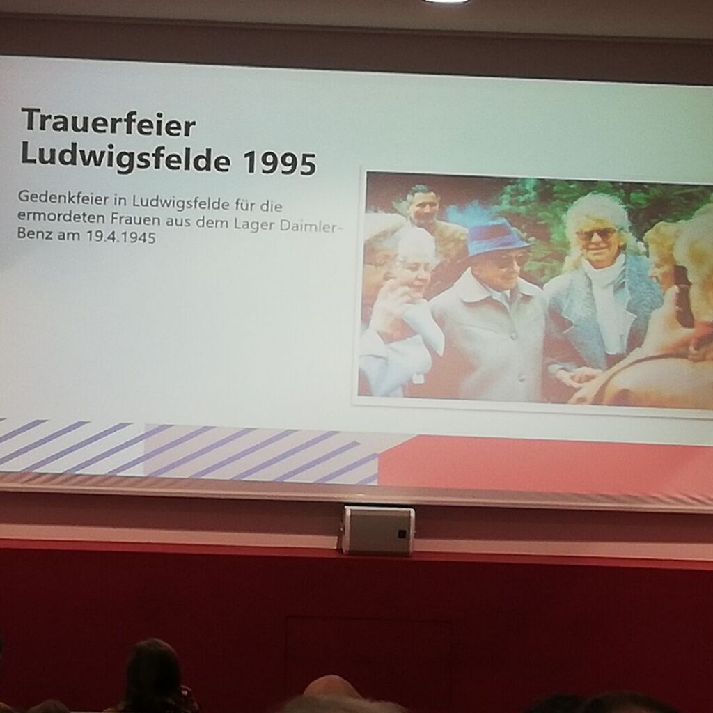 Marlene Pardeller, eine freie Filmschaffende, ging im Anschluss auf die nach 1945 geleistete Erinnerungsarbeit ein. Dabei wurden auch einige Ansatzpunkte deutlich, an denen Erinnerungsarbeit heute wieder ansetzen kann. So erwähnte sie die Publikation von Gerhard Birk aus dem Jahr 1986, die Trauerfeier zum Gedenken an die ermordeten Frauen aus dem Daimler-Benz-Lager im Jahr 1995, sowie das Pflanzen der Rosen der Auferstehung, durch die französische Häftlingsvereinigung „Amicale de Ravensbrück“ und die darauf folgende Ausstellung im Stadt- und Technikmuseum Ludwigsfelde im Jahr 2017.