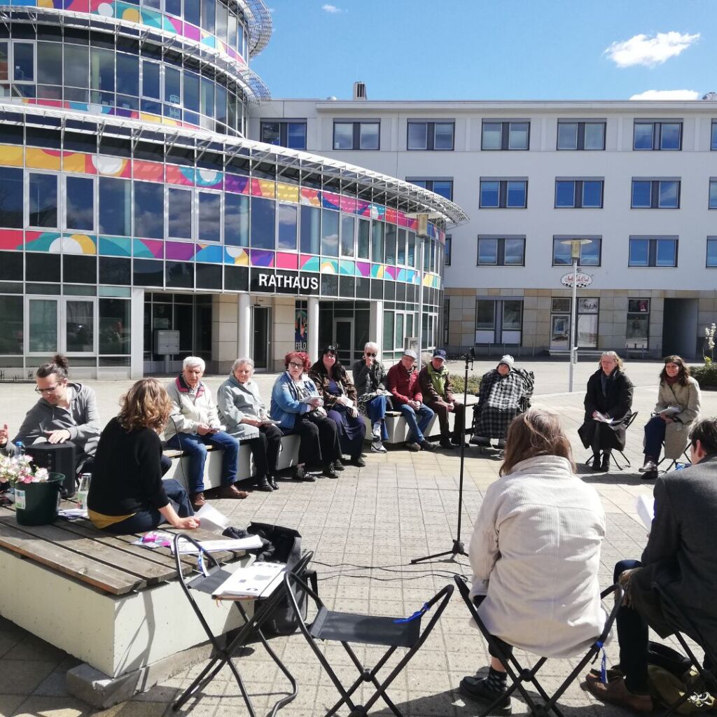 Der Arbeitskreis Zwangsarbeit gedenken organisierte in Erinnerung an die Beendigung von NS-Zwangsarbeit in Ludwigsfelde am So., dem 26.04. ´26 eine partizipative Lesung auf dem Rathausplatz mit anschließendem Gedenkspaziergang zum Zwangsarbeiter*innenfriedhof im Wald an der A10.