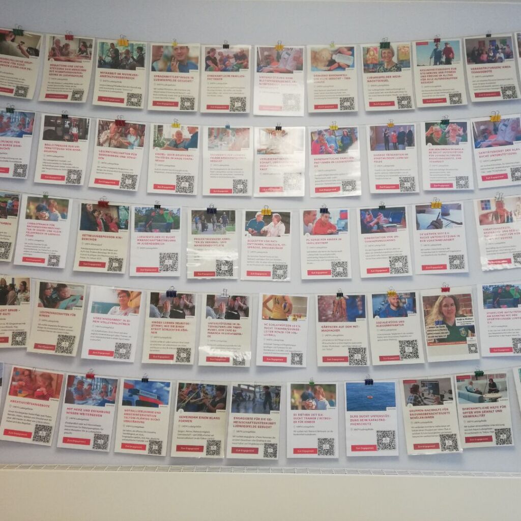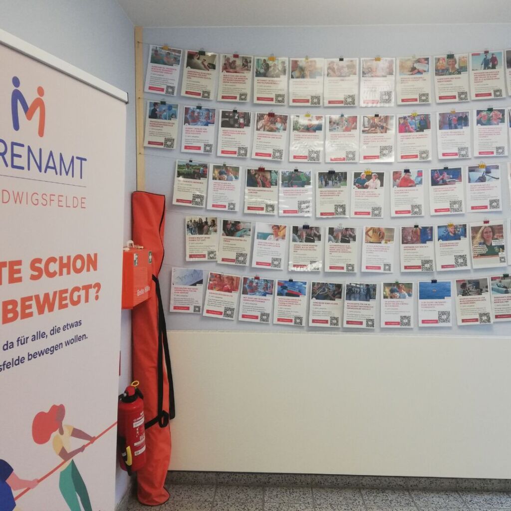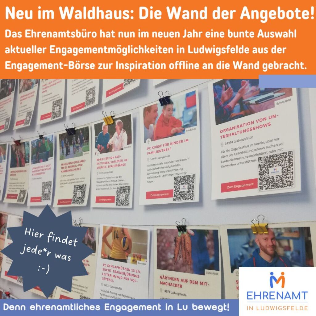 Das Ehrenamtsbüro hat nun im neuen Jahr eine bunte Auswahl aktueller Engagementmöglichkeiten in Ludwigsfelde aus der Engagement-Börse offline an die Wand gebracht. Die Gesuche sind mit einem QR-Code versehen, der bei Bedarf zu näheren Informationen führt. Die Angebote rotieren regelmäßig. Zusätzlich sind zur Anregung einige Porträts unserer Reihe "Menschen und Projekte aus Lu im Ehrenamt" eingestreut.
