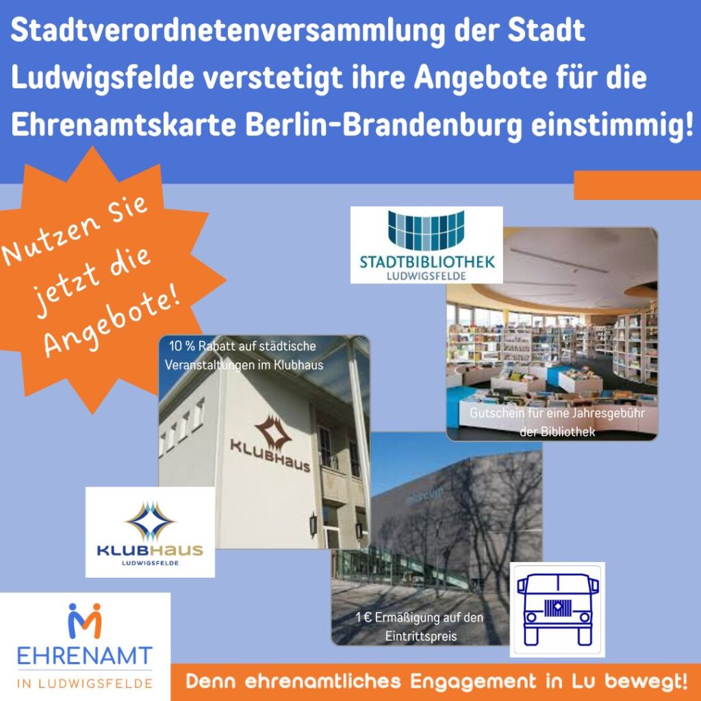 Sind Sie bereits Besitzerin der Ehrenamtskarte Berlin-Brandenburg, dann nutzen Sie die lokalen Angebote des Klubhauses, der Bibliothek, des Stadt- und Technikmuseums, von SOLBRA e.V., des Chors Ahrensdorf, der Akademie 2. Lebenshälfte, des Ludwigsfelder Fußballclub e. V., oder mehrere der 733 weiten Angebote aus Berlin oder Brandenburg!